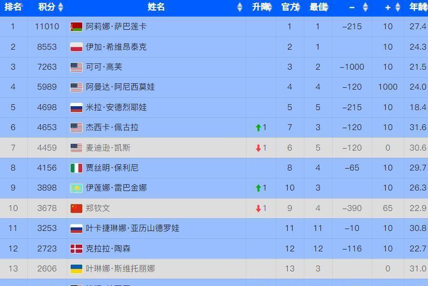 与此同时,中网的战火也让WTA前十的排名发生了显著变化。白俄罗斯名将萨巴伦卡依然以11010分稳坐世界第一的宝座。虽然因美网后休战而缺席中网,被扣除215分,但并未影响其领先地位。紧随其后的是斯瓦泰克,她以1290分的优势领先于高芙,后者若想缩小差距,恐怕要寄希望于在武汉公开赛上有所斩获。