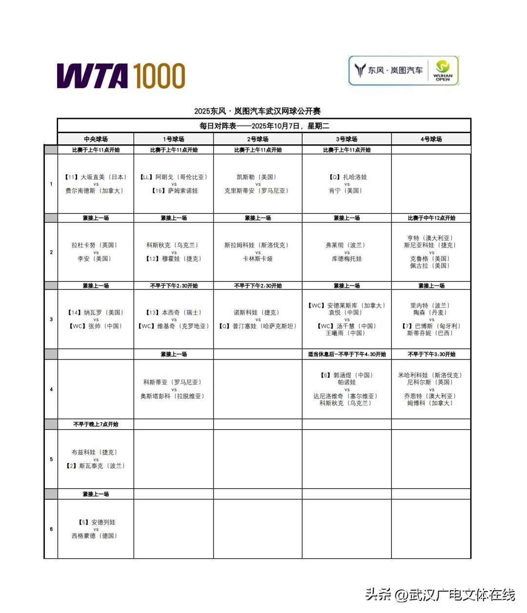 2025东风·岚图汽车武汉网球公开赛今日赛程精彩绝伦,星光熠熠。多位大满贯冠军选手,包括斯瓦泰克、大坂直美、奥斯塔彭科和肯宁,都将在今天迎来她们本届武网的首秀。与此同时,中国选手张帅也将再次挑战强敌纳瓦罗。