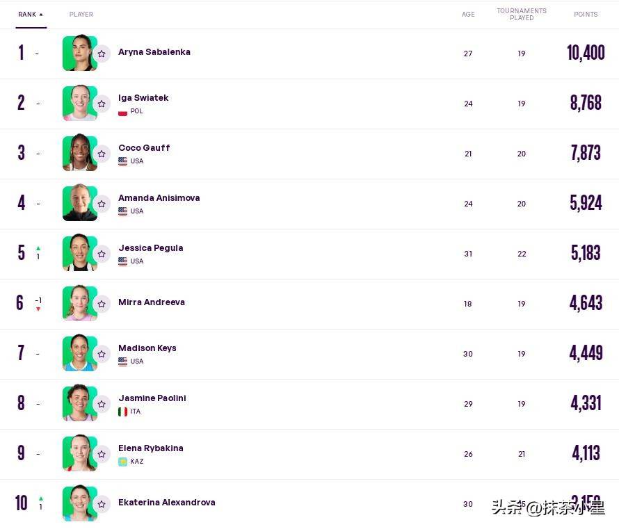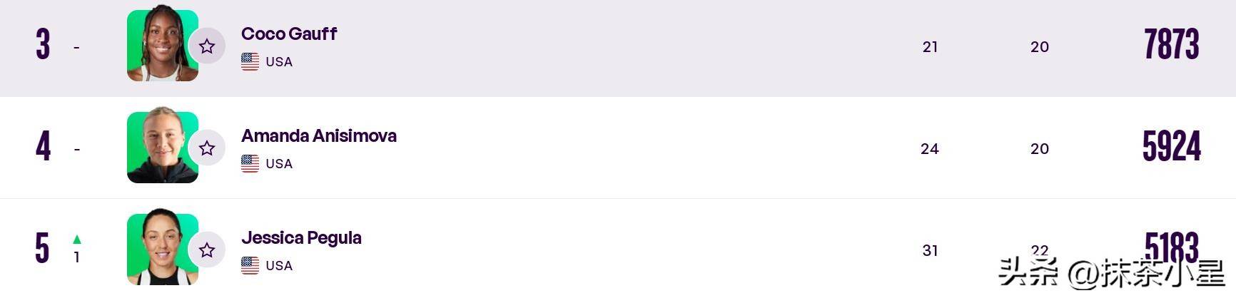 佩古拉在武汉举行的WTA1000赛打出好成绩,拿到亚军后上升1位,重新进入TOP5的行列。到此为止,TOP5中的美国球员已经达到三人,分别是NO.3高芙、NO.4阿尼西莫娃和NO.5佩古拉。若看整个榜单,TOP50里有10位美国人,TOP100里有17位美国球员,美国无疑成了女子网坛的第一强国。