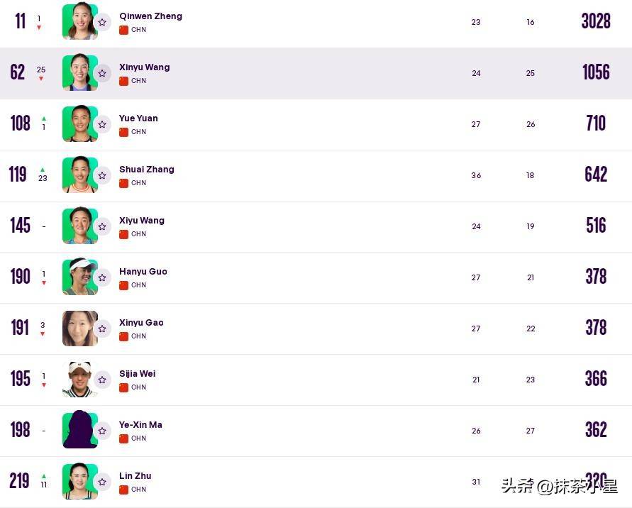 中国球员郑钦文则经历了一次明显的下滑。由于连退赛事并且失去同期的650分亚军积分,她的排名降至第11位,连续进入前10的周数被定格在89周,暂时无缘冲击李娜117周TOP10的纪录。