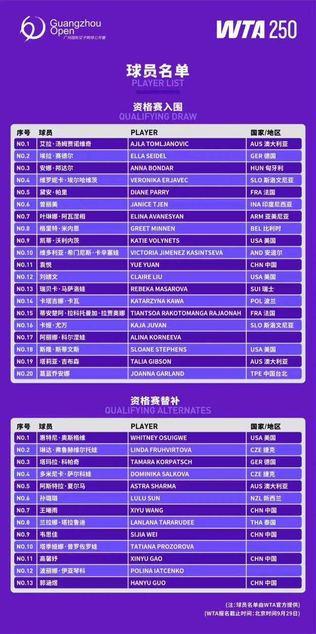 资格赛阵容也相当抢眼,广东名将袁悦、前美网女单冠军斯蒂文斯、三届大满贯八强选手汤姆贾诺维奇等众多名将在列。资格赛替补阵容出人意料,包括2023年广网冠军王曦雨,韦思佳、高馨妤、郭涵煜等多位中国名将。袁悦最高单打排名第36位,去年曾在美国奥斯汀拿下生涯首个WTA巡回赛单打冠军奖杯,这将是她连续第三年来到南沙参赛,过去两年袁悦都闯进了女单正赛第二轮,今年她的状态下滑,战绩不尽如人意,期待她在南沙有出色的发挥。斯蒂文斯是2017年美网女单冠军、2018年法网女单亚军,最高单打排名世界第三,早在2014年她就曾首次参加广网,今年将是她时隔11年重返广州参赛。澳大利亚选手汤姆贾诺维奇最高单打排名第32位,2021温网、2022温网和美网三次闯入大满贯八强,2022年美网,正是她送给了小威廉姆斯职业生涯最后一败。其他入围资格赛的选手还包括本赛季上升势头迅猛的印尼选手曾丽美,上月她刚在巴西圣保罗打进生涯首个WTA巡回赛单打决赛;上月在长沙和湖州背靠背拿到两个WTA125冠军的斯洛文尼亚选手埃尔哈维茨以及赛德尔、邦达尔、帕里、阿瓦涅相、沃利内茨等一众名将。