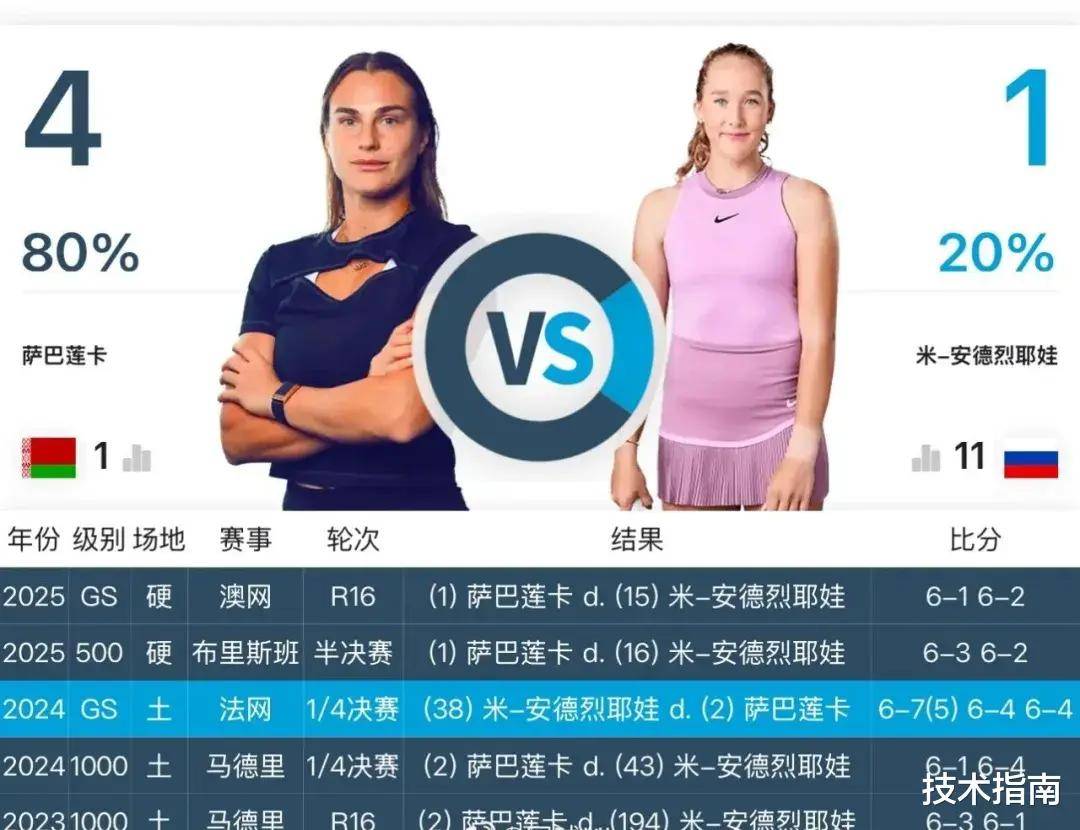 从交手记录看,萨巴伦卡4胜1负占据绝对优势,最近两次交手更是只让安德列娃拿了1局。但千万别小看这位17岁少女——过去两周她豪取11连胜,先在迪拜站爆冷夺冠,接着在印第安维尔斯连克奥斯塔彭科、斯瓦泰克等猛将,尤其是半决赛逆转世界第二斯瓦泰克一战,堪称“心脏比钢铁还硬”。