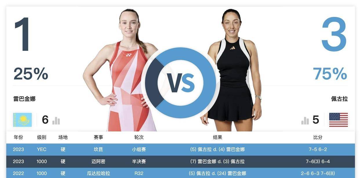 另一场半决赛在莱巴金娜和佩古拉之间展开。 从历史战绩看,佩古拉以3胜1负占据明显优势。 但莱巴金娜目前的状态可谓势如破竹,从压线入围到小组赛三战全胜首次杀入总决赛四强,她手感和信心都处于巅峰。 这场比赛的悬念在于,是佩古拉凭借历史战绩和心理优势继续压制对手,还是莱巴金娜用火热的现场状态打破过往的劣势。