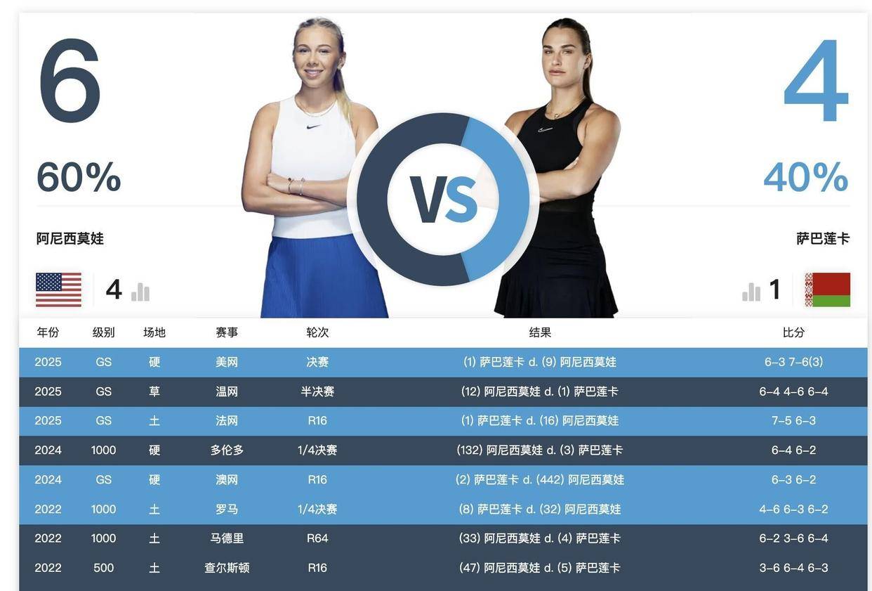 现在,半决赛的对阵已经敲定:萨巴伦卡迎战阿尼西莫娃,莱巴金娜对阵佩古拉。 这两组对决充满了故事性。 萨巴伦卡虽然贵为世界第一,且在刚结束的比赛中轻松击败了高芙,但当她面对阿尼西莫娃时,历史交手记录却并不占优。 数据显示,萨巴伦卡以4胜6负落后于阿尼西莫娃。 就在不久前的硬地赛事中,阿尼西莫娃也曾战胜过她。 这场半决赛,无疑是阿尼西莫娃报美网决赛失利之仇的绝佳机会。
