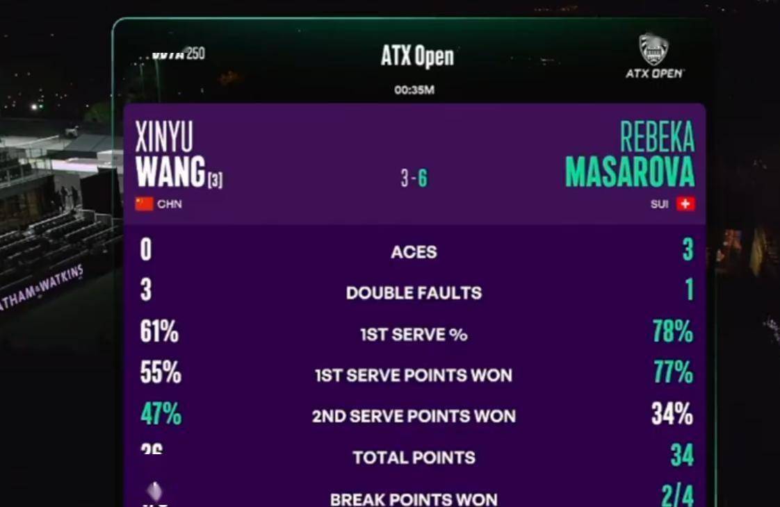 比赛于北京时间2月24日打响。 第一盘,前三局双方各自保发,战成2-1。 转折点出现在第4局,王欣瑜的发球局遇到了烦。 马萨洛娃频频施压,虽然王欣瑜顽强地挽救破发点,但最终还是没能守住,遭到破发。 马萨洛娃以3-1领先。第7局,王欣瑜稳住阵脚,成功回破,将比分追至3-4,重新看到了希望。然而,好景不长。 第8局,王欣瑜的发球局再次失守,马萨洛娃以5-3领先,并拿到了发球胜盘局。 在第9局,马萨洛娃没有给王欣瑜任何机会,直落四分,以6-3的比分拿下了第一盘。 从首盘的技术统计来看,王欣瑜完全处于下风。 ACE球方面,马萨洛娃有3个,而王欣瑜是0个。 双误方面,王欣瑜却有3个,比对手多出2个。 更关键的是发球进球率和一发得分率,王欣瑜这两项数据都明显落后于对手。 整盘比赛的总得分,王欣瑜也落后了8分。 这些数据清晰地表明,王欣瑜赖以成名的发球武器在这一盘完全失灵,而马萨洛娃则打得积极主动。