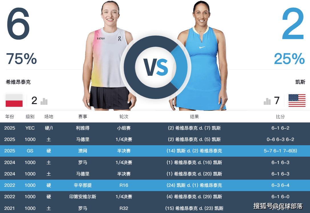 双方过往碰面次数不少,包括今年的澳网、马德里站,两人各胜一场,现在来到年终总决赛,斯瓦泰克取得了完胜。